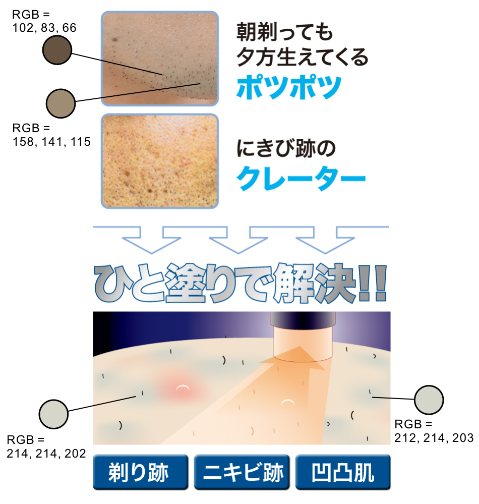 ヒゲ隠しスティックの宣伝に色の錯視を発見。髭の生えるあたりの色相は黄色い(髭は暗いオレンジ色)ということを我々は知っているのですが、この絵では模式図に錯視を使って、「黄色の色相なのに青く見える」を実現しています! このデザイナーの観察力はすばらしい。この画像の載っているサイトはこちらです。 http://item.rakuten.co.jp/shop405/dr-1990/?scid=af_pc_link_mail&sc2id=323335659 (ラグディ すべ肌 ファンデ スティック 青ヒゲ隠し ライトベージュ 通販 (T1) apap8)(?)