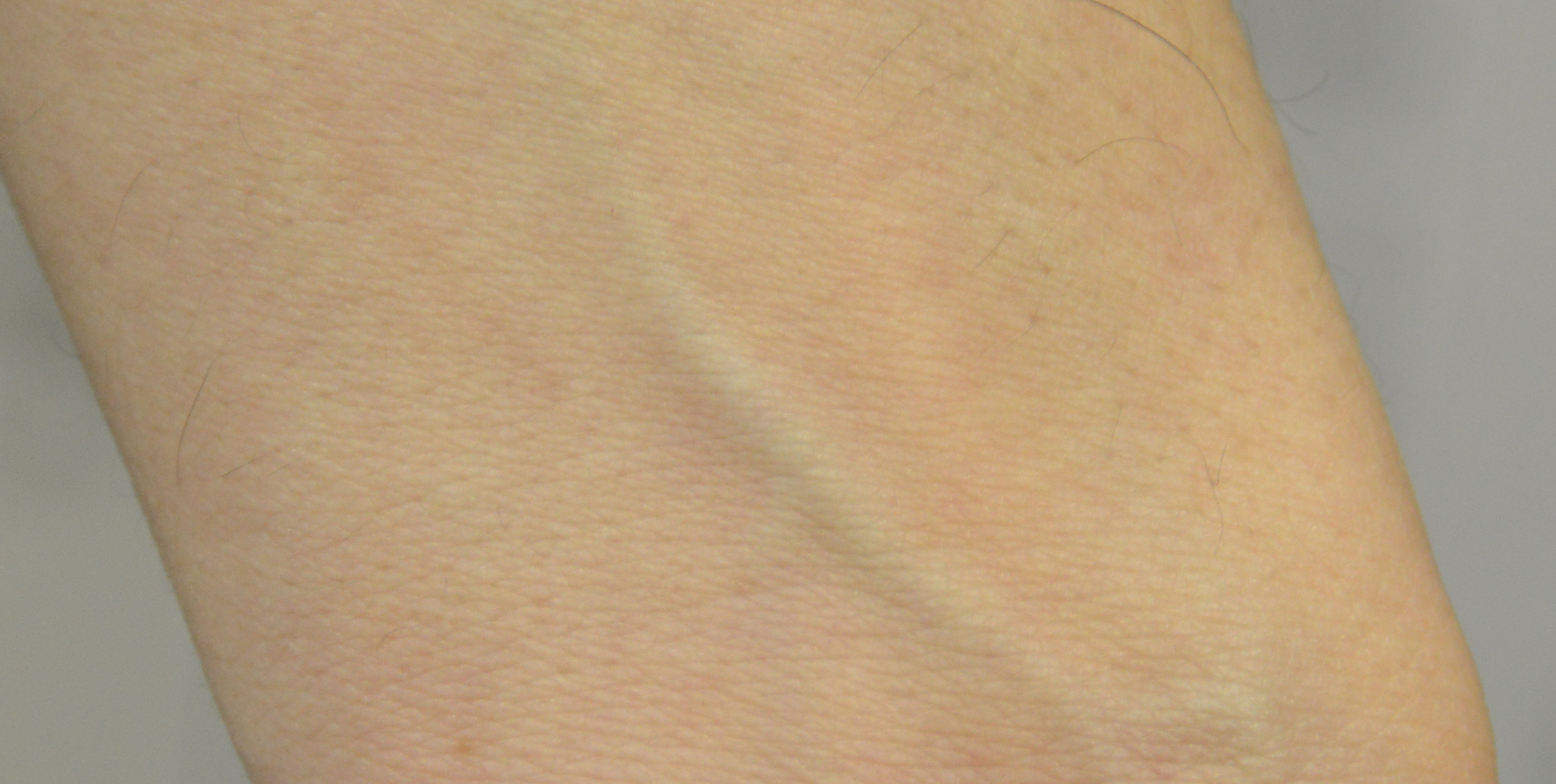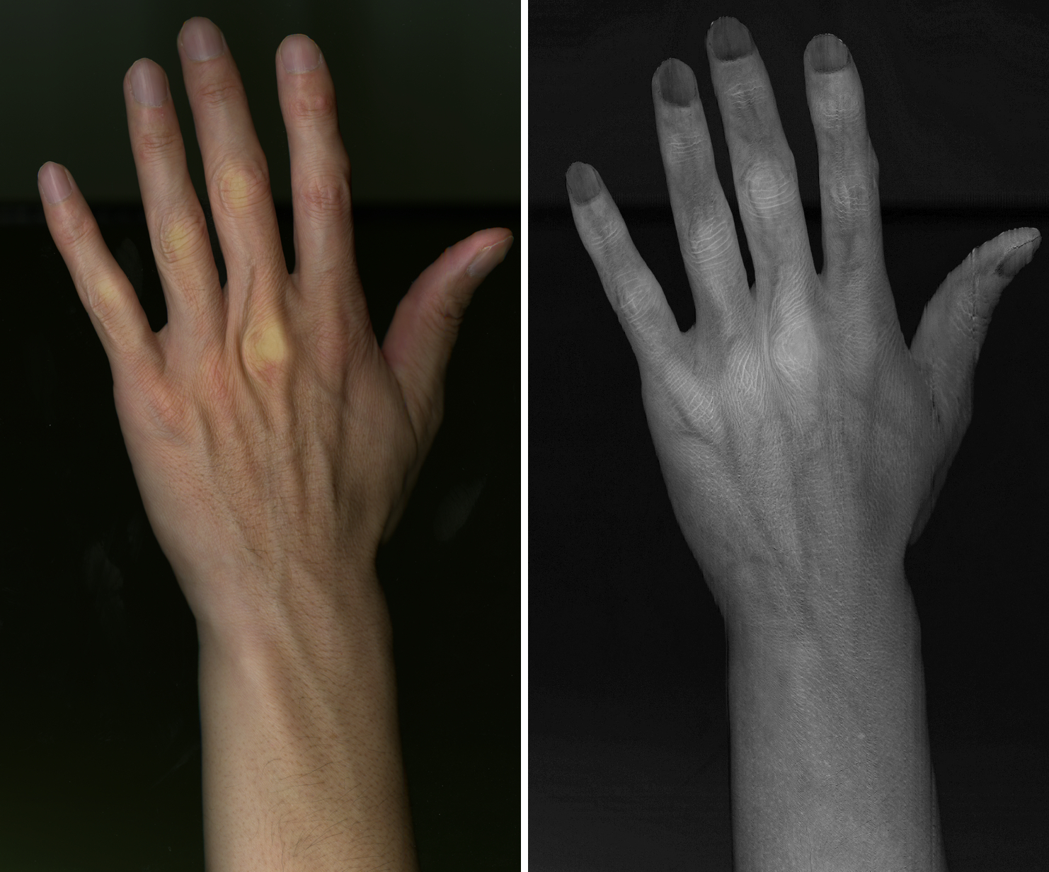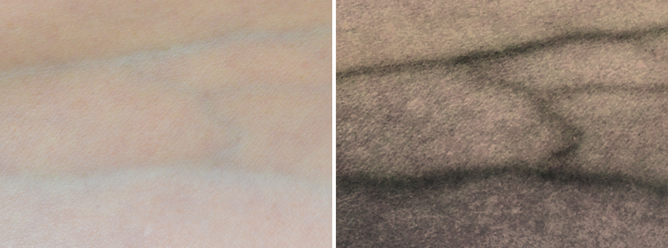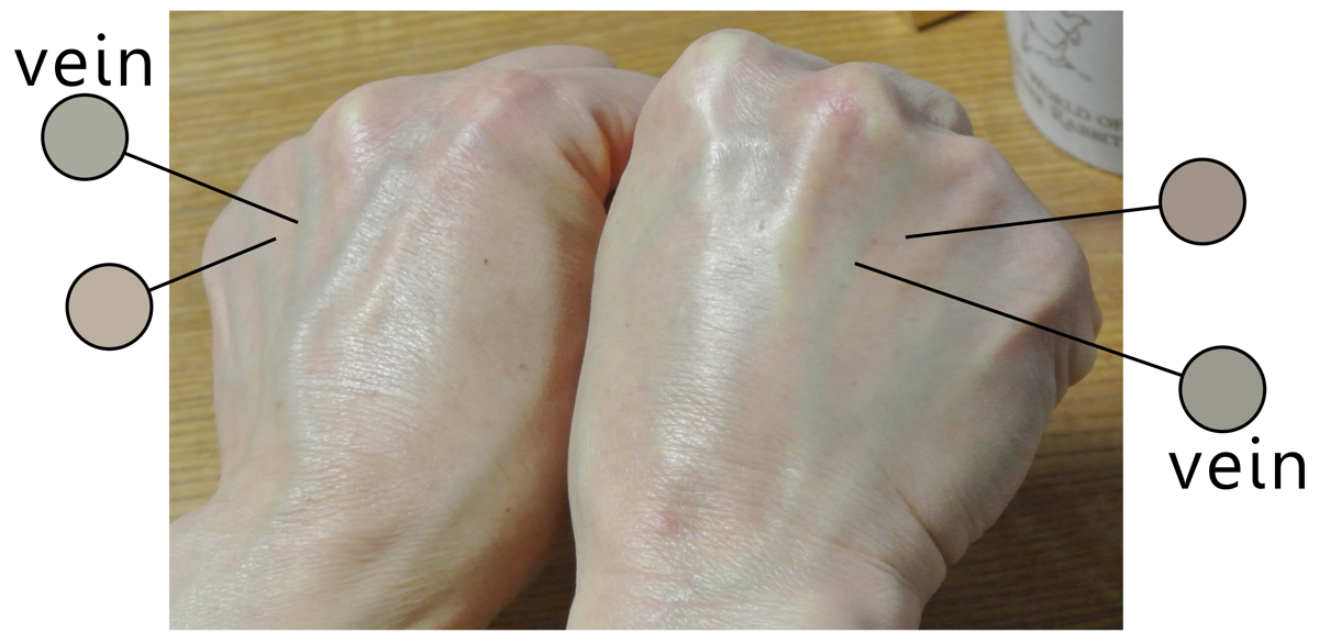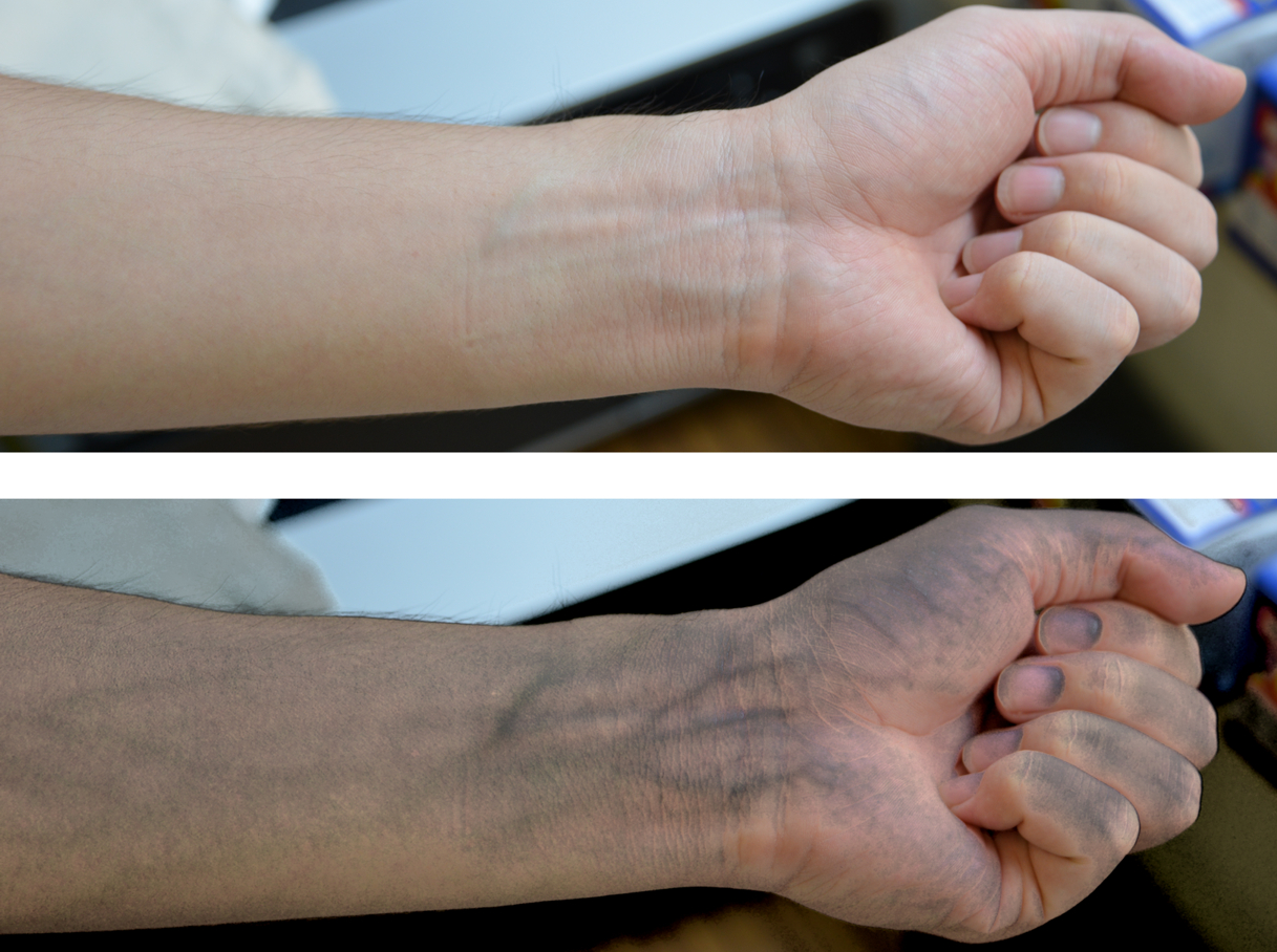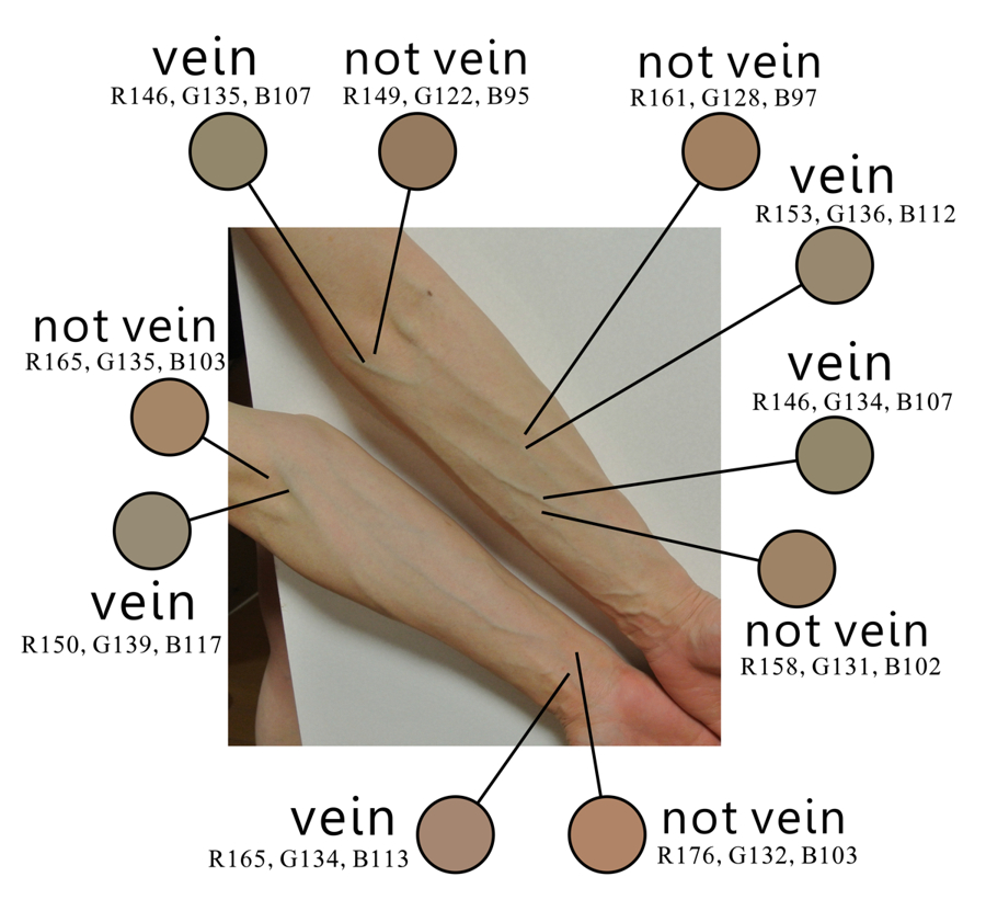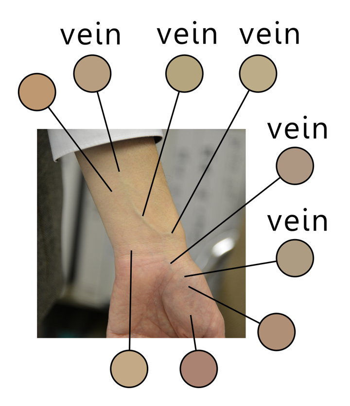 この手の青く浮き出て見える静脈は物理的には青くなく、ほぼ灰色あるいは彩度の低い黄色であった。