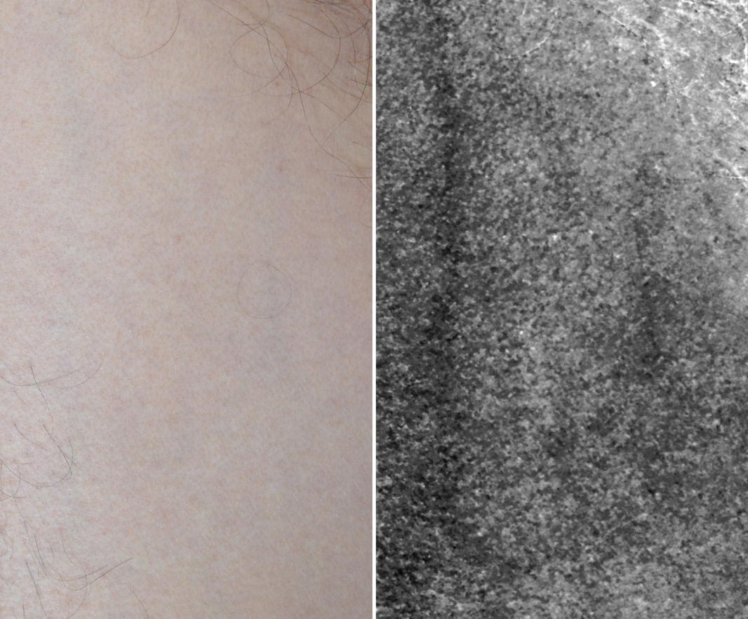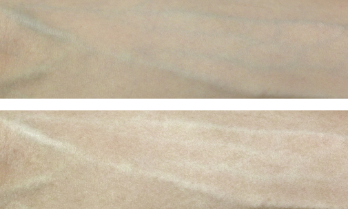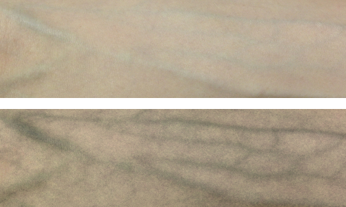「皮膚の下の静脈は青く透けて見えます。しかし、写真を拡大してみるとわかりますが、物理的には青くありません。せいぜい灰色かあるいは「肌色」(赤みのある黄色の一種)です。そうです、静脈が青く見えるのは色の錯視だったのです。現象としては「色の対比」ということになります。より鮮やかな「肌色」に囲まれた灰色あるいは鮮やかさの少ない「肌色」の静脈に、「肌色」の反対色である緑みのある青が誘導されている、と考えるのが妥当です。」