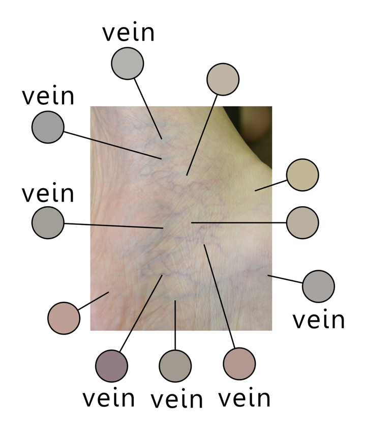 (静脈の色は知覚に依存している。静脈の周りの明るい暖色と比較することで実際より青く見える。皮下にあれば、動脈も静脈と同様に見える。)