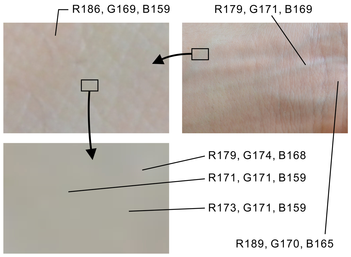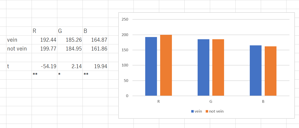 「「皮膚下部に静脈がある箇所の色」と「周囲の皮膚部分の色」を比べると、「皮膚下部に静脈がある箇所の色」は(周囲に比べると)青色光の強さは他の部分と同じくらい強く返ってくるのに、赤色の光は周囲よりも少ない量しか返ってこない…というわけで、「(近傍周囲と比較すると)皮膚の上から見た静脈が青色がかる」ということになります。」