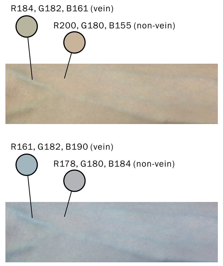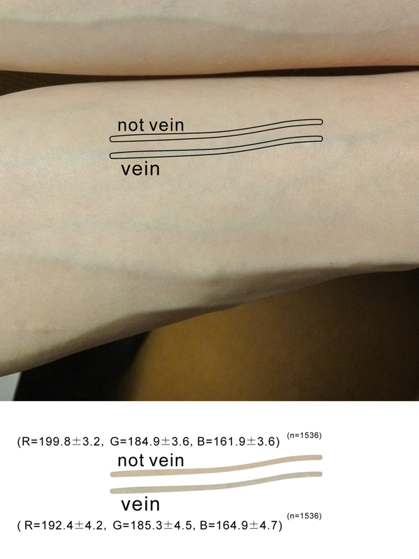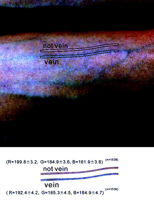 「室蘭工業大学の相津佳永助教授(現・教授)の測定によると、静脈の上の皮膚は赤みが少なく、周辺は赤みが多かったが、いずれも肌色であった。赤みが少ない分、相対的に青っぽく感じる。東京工業大学の山口雅浩助教授(現・教授)によると、光の散乱が関係している。赤い光は皮膚の奥まで届き、ヘモグロビンが赤い光を一部吸収するから静脈の赤みが少なくなる。 」