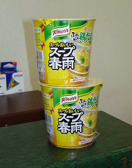 カップヌードルの容器を上下に重ねて置くと、下に置かれた方が上に置かれた方よりも大きく見える。