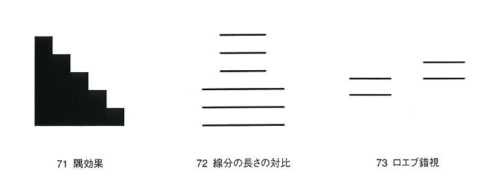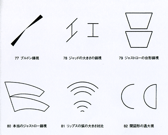 ●錯視には、形の錯視(幾何学的錯視)、明るさの錯視、色の錯視、運動視の錯視などがある。