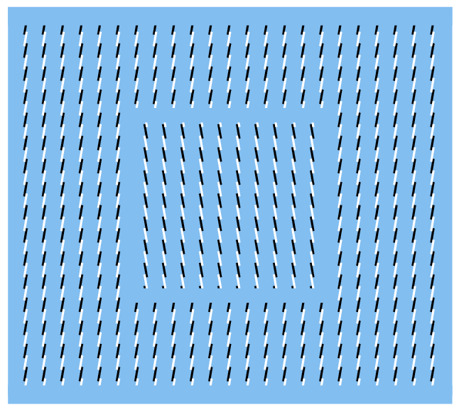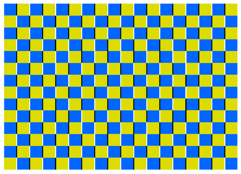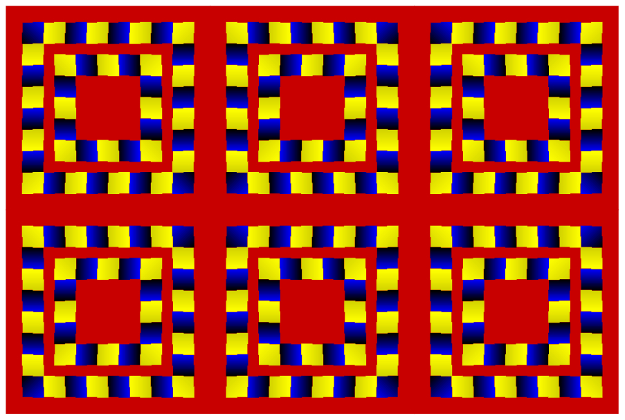 図で6つある「回」という字は、青と黄の要素図形を正方形状に配列してあるのだが、ひずんで見える(ずれたエッジの錯視)*。また、回という字が動いて見える。