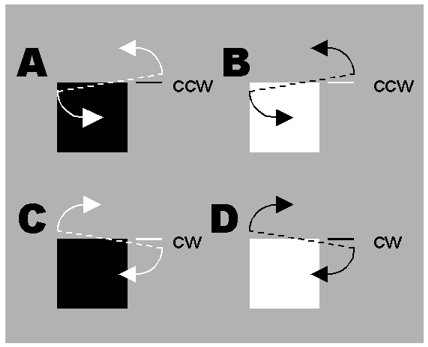 この動画では「目」が時計回りに2秒間回転、2秒間静止を繰り返している。静止している時、目は時計回りに回転して見える。両目の中間に視線を置いている時は目の内側が回転して見え、さらに周辺視で見ると目は全部回転して見える。