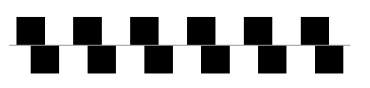 北岡明佳のコメント: この錯視を基本図形にすると下図の通り。垂直な棒が、左から、右・左・右・左・右に少し傾いて見える。(動く錯視も入っているなあ)