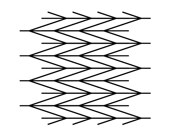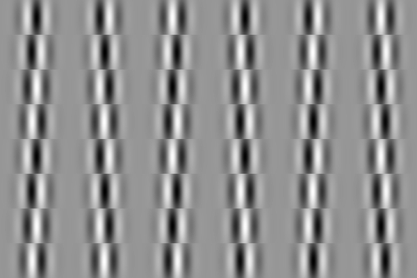 ひだの付いた金網が垂直軸を軸に回転しているように見える。上から1、3、5、7、9番の水平線が手前に見える時は、金網は観察者に対して右側方向に面しているように見え、次第に観察者に向かって面を回転してくるように見える。逆に、上から2、4、6、8番の水平線が手前に見える時は、金網は観察者に対して左側方向に面しているように見え、次第に観察者に向かって面を回転してくるように見える。