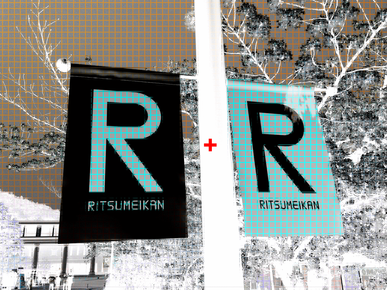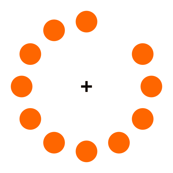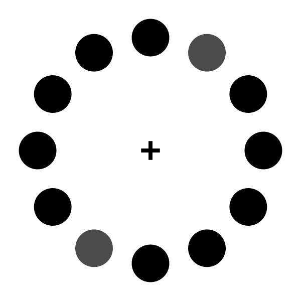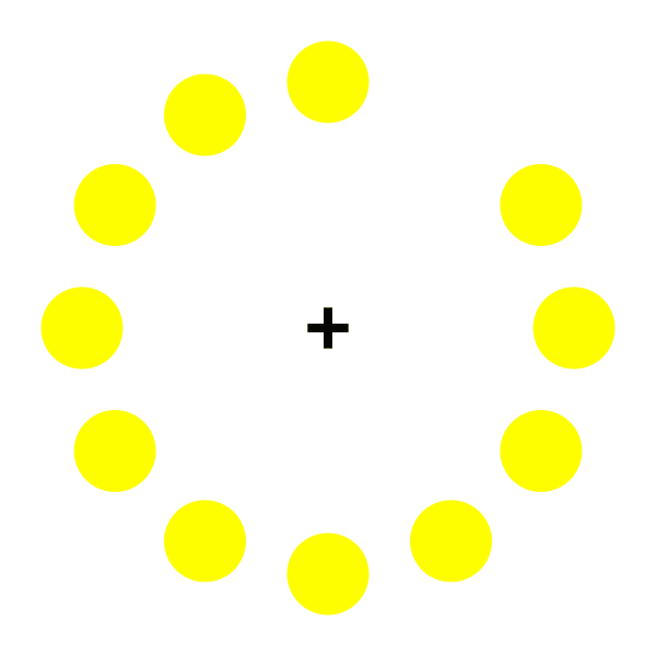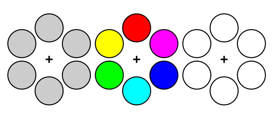 Watch the left cross more than ten seconds and move the gaze to the right cross, illusory color beads are observed above or below the cross. The nine beads in the upper afterimage appear to be red, while those in the lower afterimage appear to be yellow. Since the eighteen beads in the left image are gray (R=178, G=178, B=178), achromatic stimuli generate chromatic afterimages!