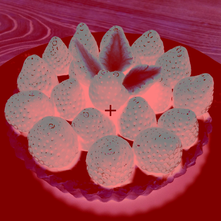 The adaptation image consists of reddish pixels, but its afterimage shows red strawberries.