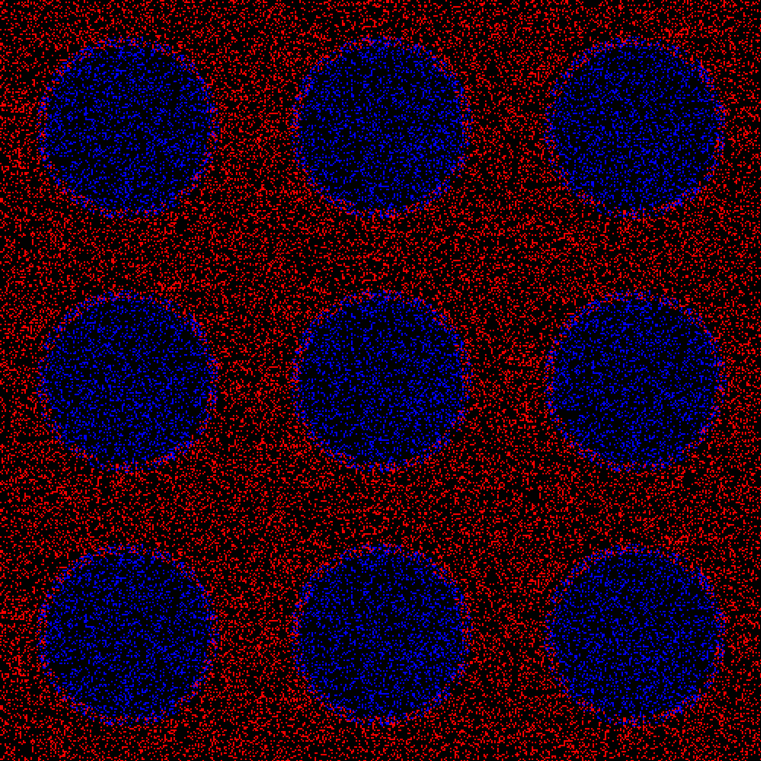 There appear to be blue holes. The effect is strong when the image is seen from apart. Moreover, dots of the circumference of each hole appears to be purple-red, though they are the same red as the surrounding dots.
