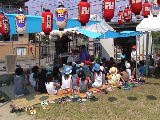 The festival starts when obo-san (a priest of Buddhism) prays for an ojizo-san (Jizo-bosatsu, kind of "Buddha")