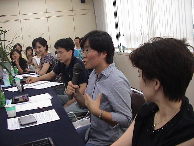 右・出席者からの質問・フロアからの質問、それぞれ活発でした。 下・答える高橋さん。 右下・日本の保育園事情について親の立場から説明するソンアさん。 |