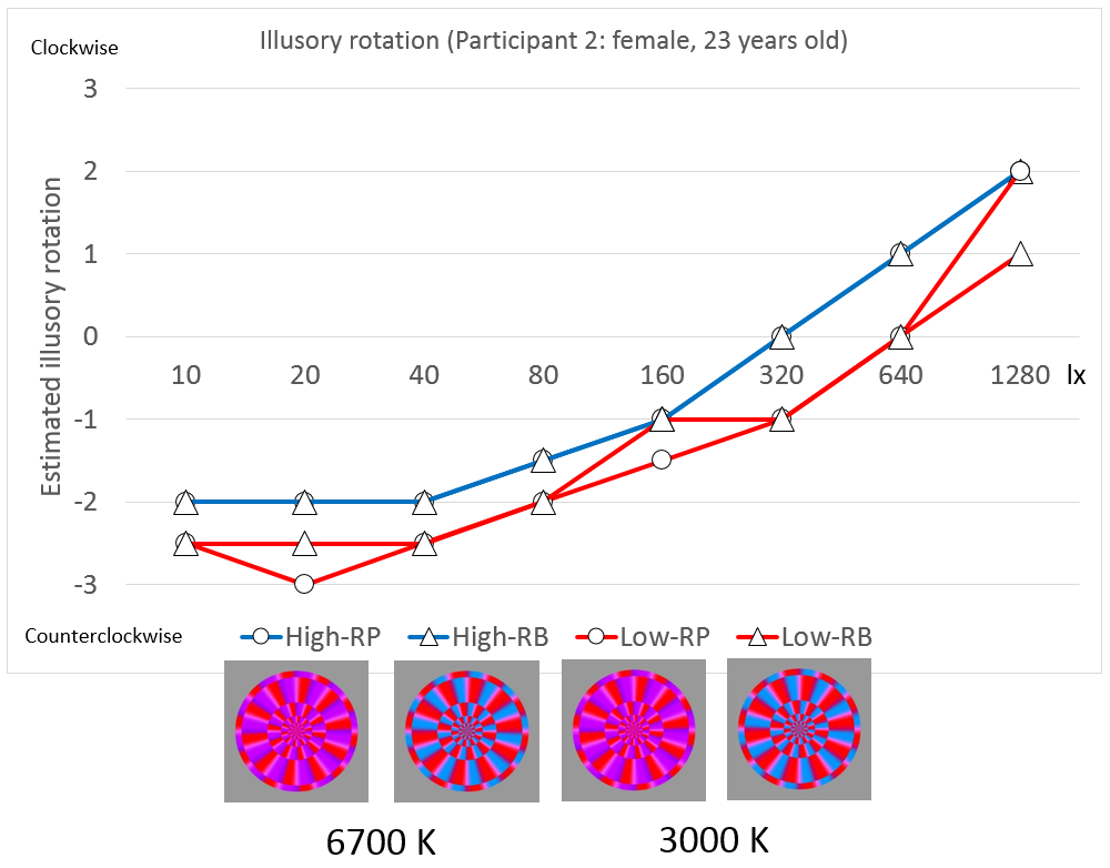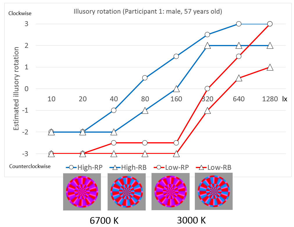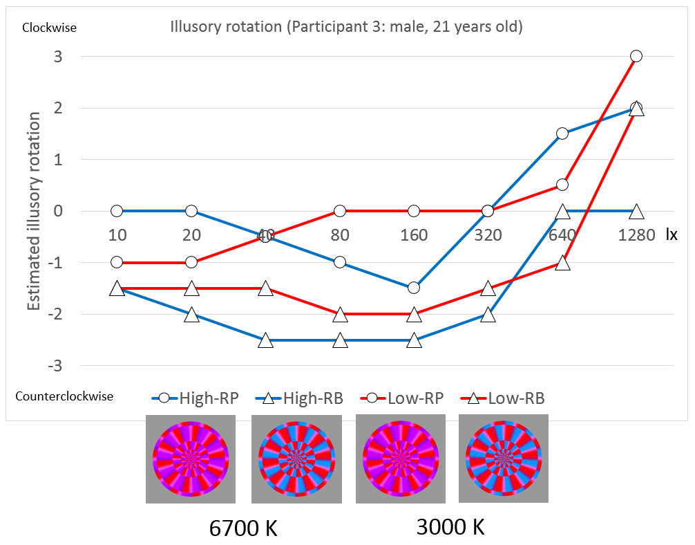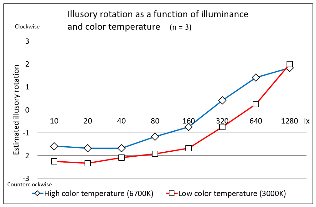 Procedure: Sessions 3000K and 6700K were tested separately. In each session, participants first adapted to the environment of 10 lx illuminance for 5 minutes. They rated illusion in the 10 lx condition and after that they adapted to the 20 lx condition for 1 minute. They rated illusion in the 20 lx condition and after that they adapted to the 40 lx condition for 1 minute, and so on (ascending trial). A descending trial was followed.