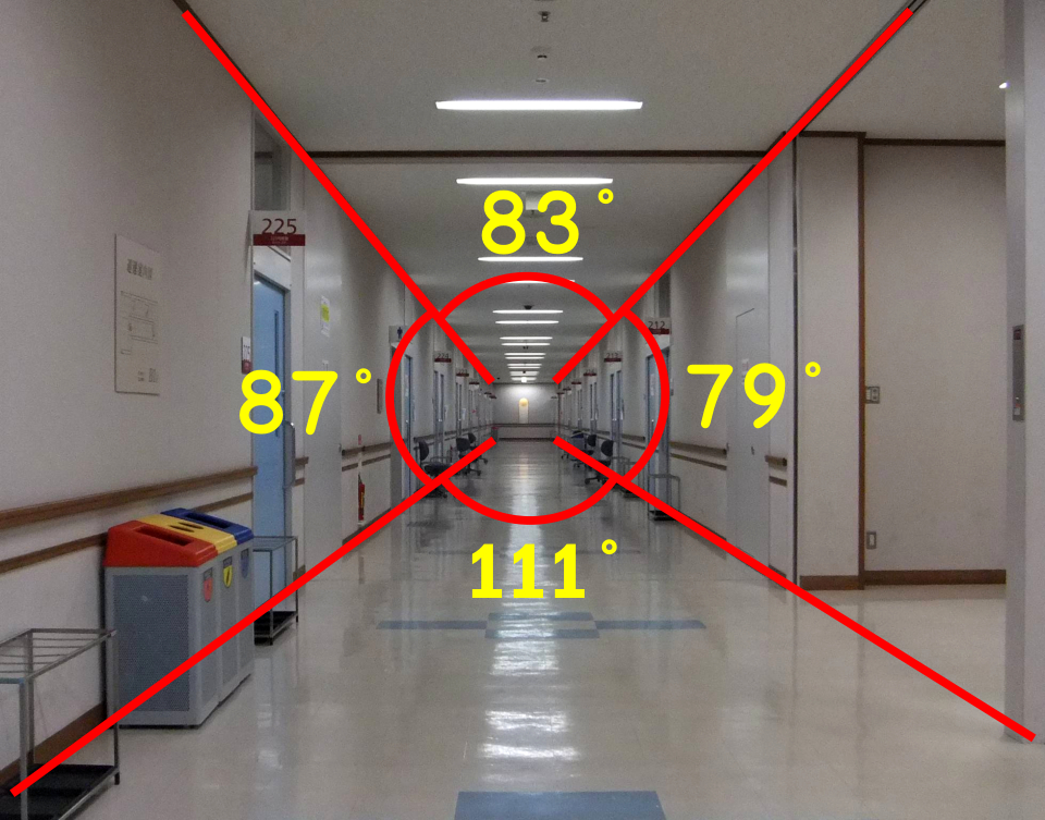網膜像としては、右のこちらに凸の隅の高さは左の奥まった隅の高さの2倍程度に見える(上図)が、実際には2倍以上(2.67倍)ある(下図)。