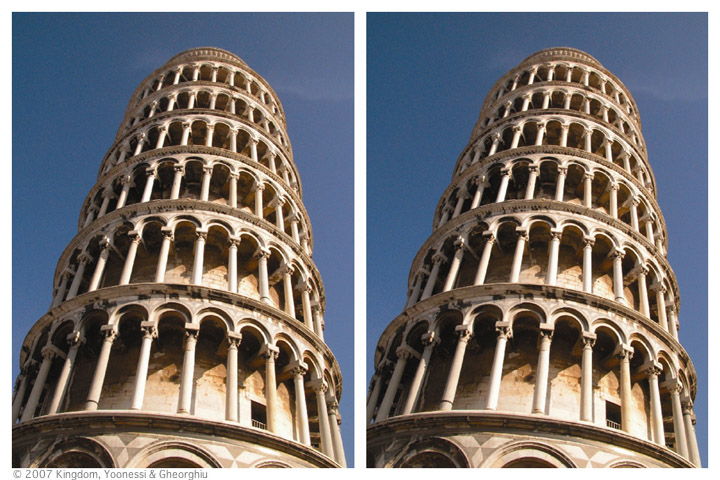 左右の写真は右方向に傾いたように撮影した斜塔であるが、右の写真の傾きが大きく見える(Kingdom et al., 2007)。