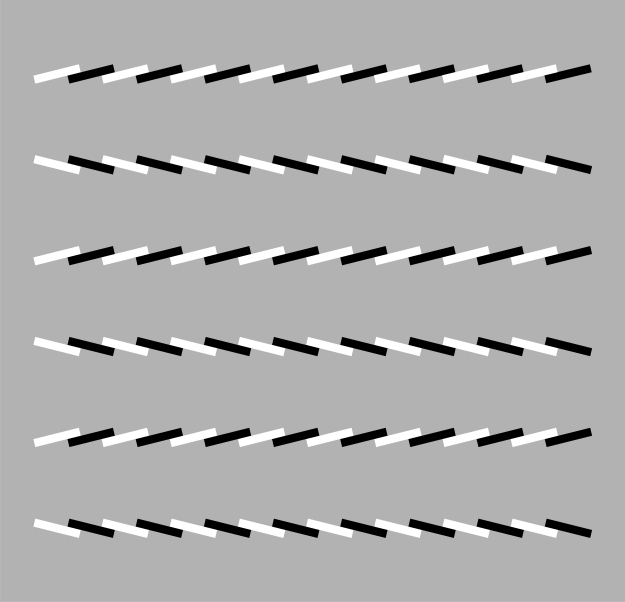 互いに平行な6本の横線が上から右・左・右・左・右・左に交互に傾いて見える(ツェルナー錯視)。それらが動いて見える。
