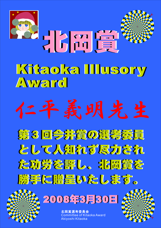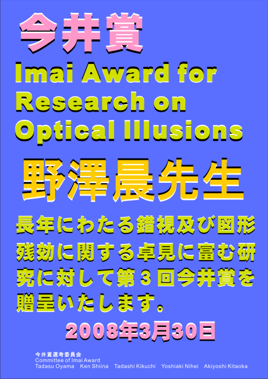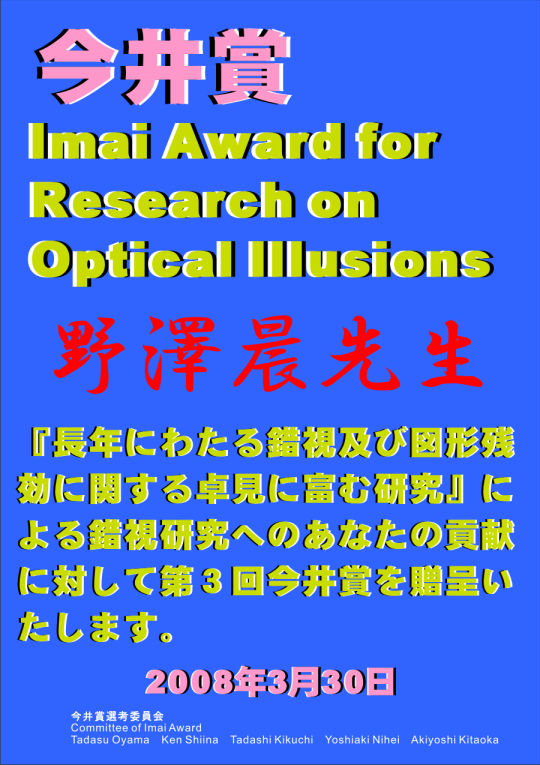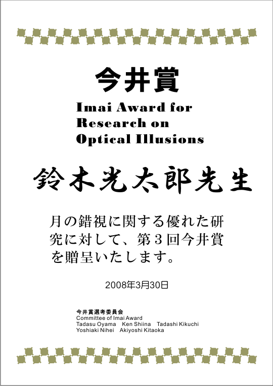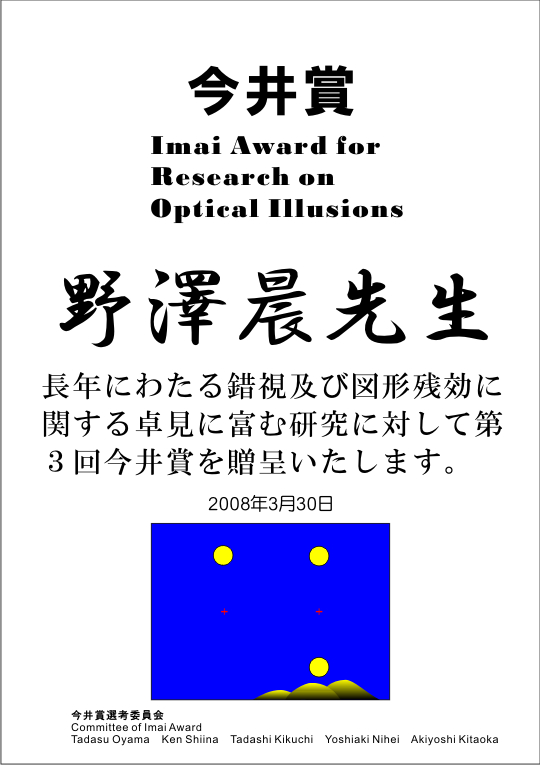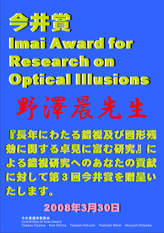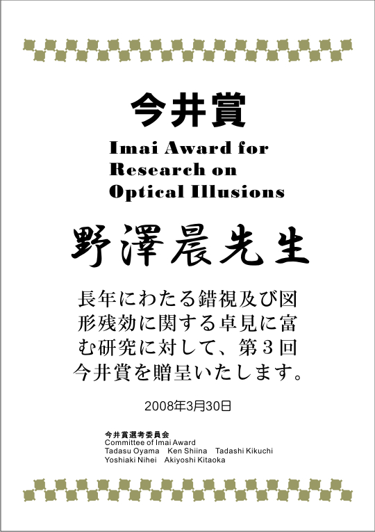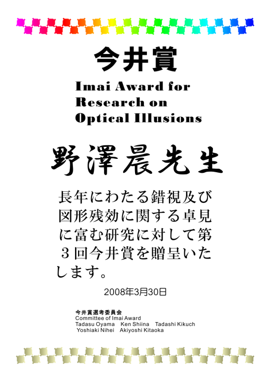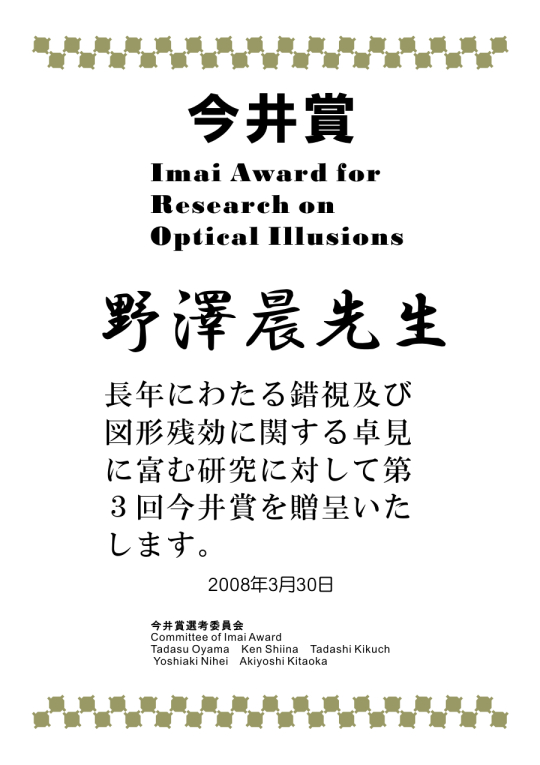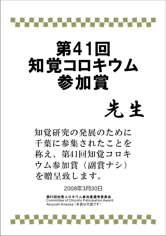 追伸 このページは、第41回知覚コロキウム(千葉大学主催・ウェルサンピア千葉)内で行なわれた第3回今井賞(錯視の館賞)授賞式にて(2008年3月30日)、北岡がプレゼンしたものである。当日は、作成した賞状のデザインがどのようなものであるかわかりやすくするため、「第41回知覚コロキウム参加賞」(下図)を配布し、理解の助けとした。なお、第3回今井賞の受賞者は、上記の賞状からもわかるように、野澤晨(のざわ しん)先生と鈴木光太郎(すずき こうたろう)先生である。ちなみに、第1回受賞者は、大山正(おおやま ただす)先生と北岡の2人で(記事)、第2回受賞者は、今井省吾(いまい しょうご)先生と藤田和生(ふじた かずお)先生と野口薫(のぐち かおる)先生(当時も故人)の3人であった(記事)。今井省吾先生は錯視研究の大御所であるが、今井賞の「今井」は、北海道大学名誉教授の今井四郎先生の「今井」である。 <2008年4月1日>