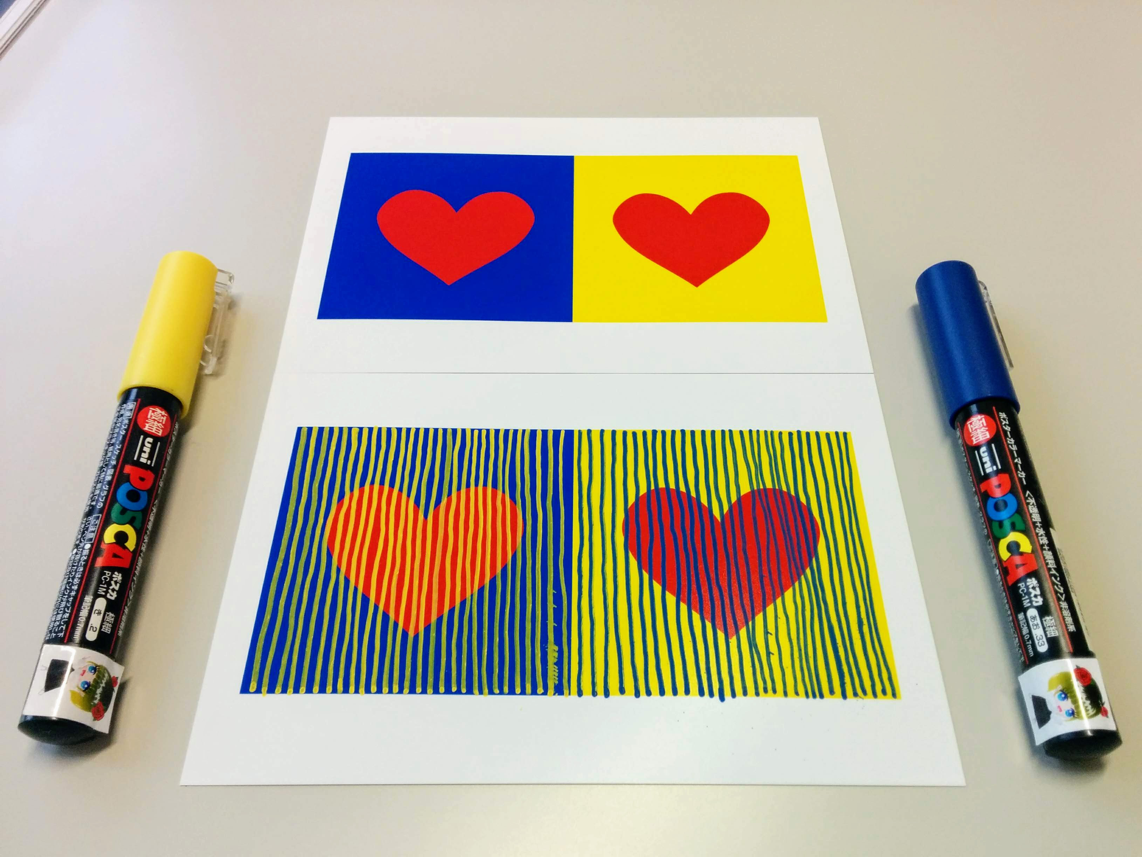 Illusory yellow is observed outside the hearts, but the color is white.