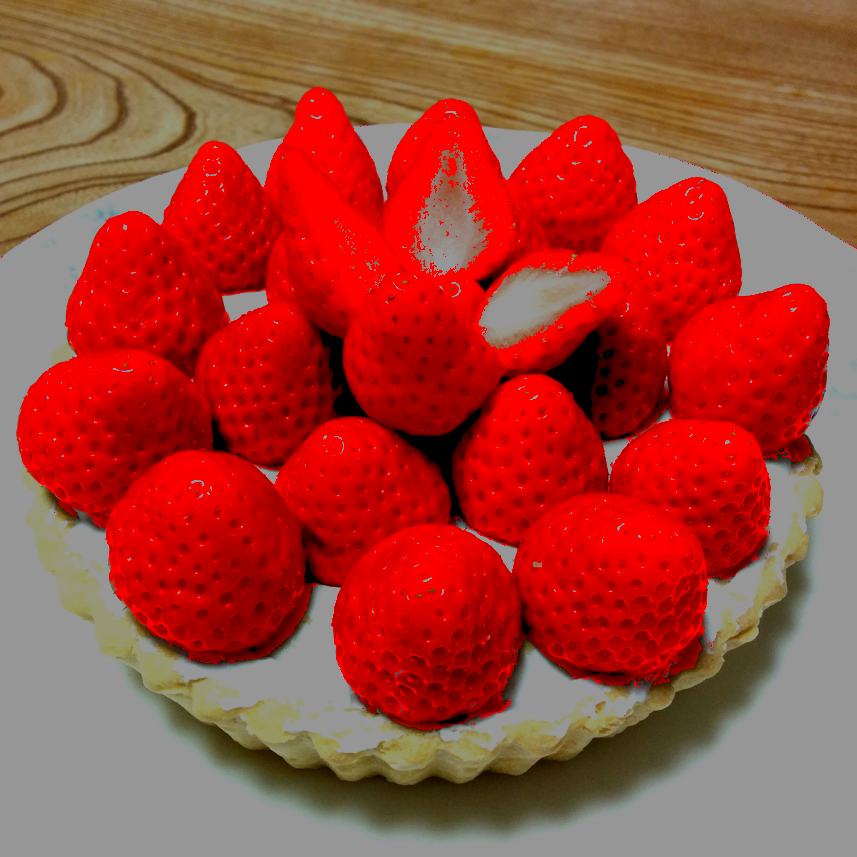 Strawberries appear to be reddish, though each pixel is cyan hue.