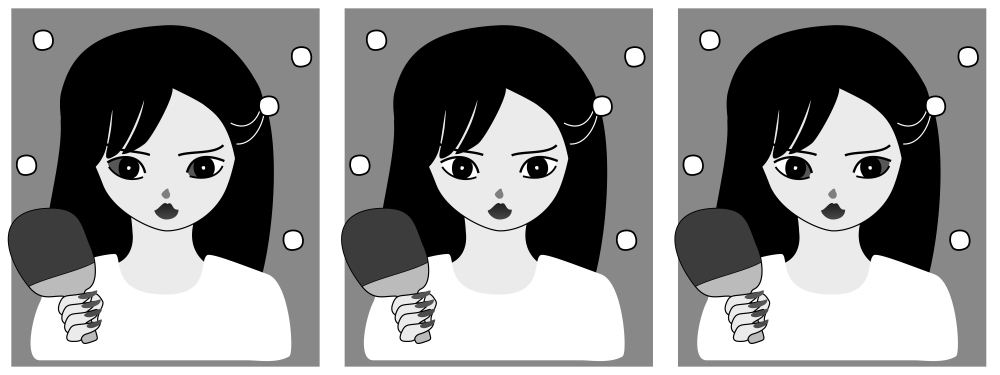 3つの図は、黒目における瞳孔の位置を除いて同一であるが、左の図は向かって左方向を、中央の図は正面を、右の図は向かって右方向を人物が見ているように見える傾向がある。瞳孔の方向に、みかけの視線方向が寄る現象である。