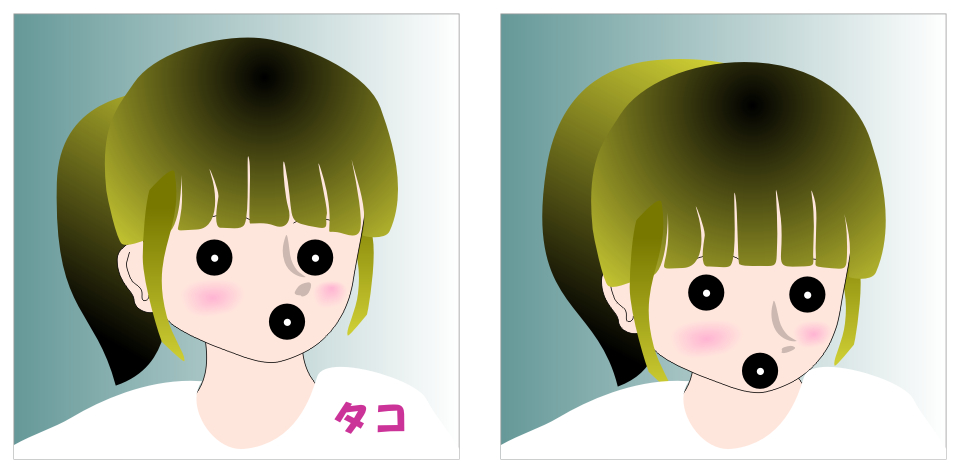 鼻と口を左右に2つ描くと、鼻と口が左右にガクガクして見えるだけでなく、ついでに目までガクガクして見える。