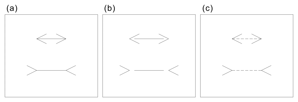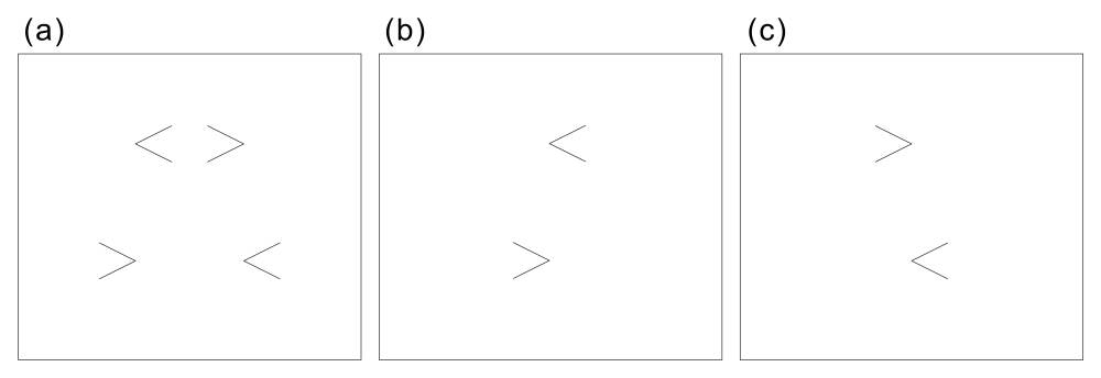 Figure 3. Morinaga's paradox, Type I (size illusion vs. position illusion). (a) The Müller-Lyer illusion remains even if the horizontal line is not real but subjective. On the other hand, the perceived alignment of the tips is reversed (Morinaga misalignment illusion) when the observer pays attention to either the left half (b) or the right half (c).