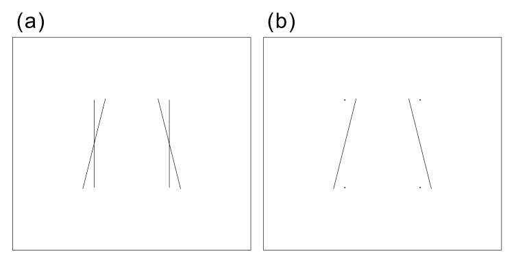 Figure 4. Morinaga's paradox, Type II (orientation illusion vs. size illusion). (a) The Zöllner illusion. The two vertical lines appear to tilt as if they are tapered downward. (b) On the other hand, the perceived distance between the line ends of each horizontal pair is reversed when dots are drawn at the ends of the vertical lines. The upper distance appears to be shorter than the lower (size illusion). As observed by one of the present authors (Kitaoka) the position illusion accords with the size illusion and is rather clear when the observer pays attention to either the left half or right half, in which the left alignment appears to tilt clockwise while the right counterclockwise.