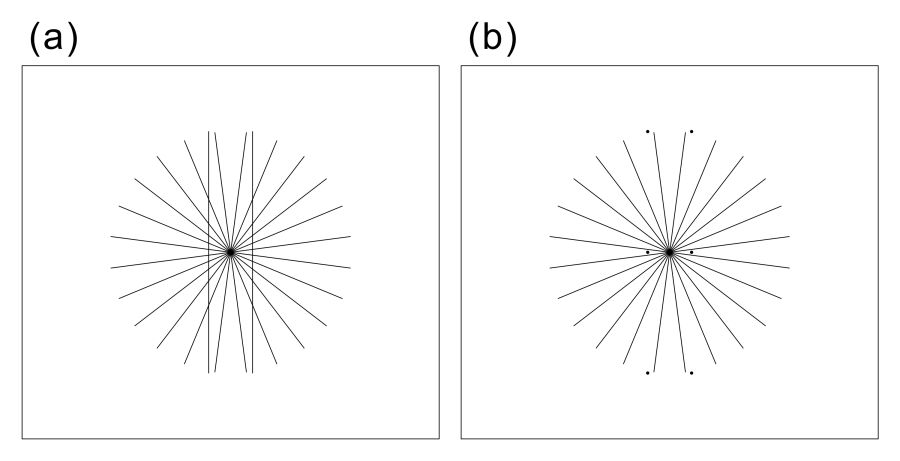 Figure 5. Morinaga's paradox, Type II. (a) The Hering illusion. The two vertical lines appear to bulge outward. (b) Conversely, the virtual line connecting the line ends and the middle point of each vertical line appears to curve inward.