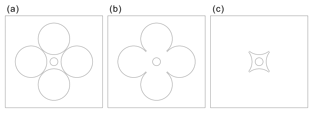 Figure 6. Morinaga's paradox, Type III (size contrast vs. size assimilation). (a) The underestimation effect of the Ebbinghaus illusion. The circle surrounded by larger circles appears to be smaller than it is. This effect is not given from the proximal parts of the larger circles as suggested by the vector-field theory. (b) When their proximal parts are removed, the underestimation effect of the Ebbinghaus illusion remains. (c) If their distal parts are removed, the inner circle appears to be larger than it is.
