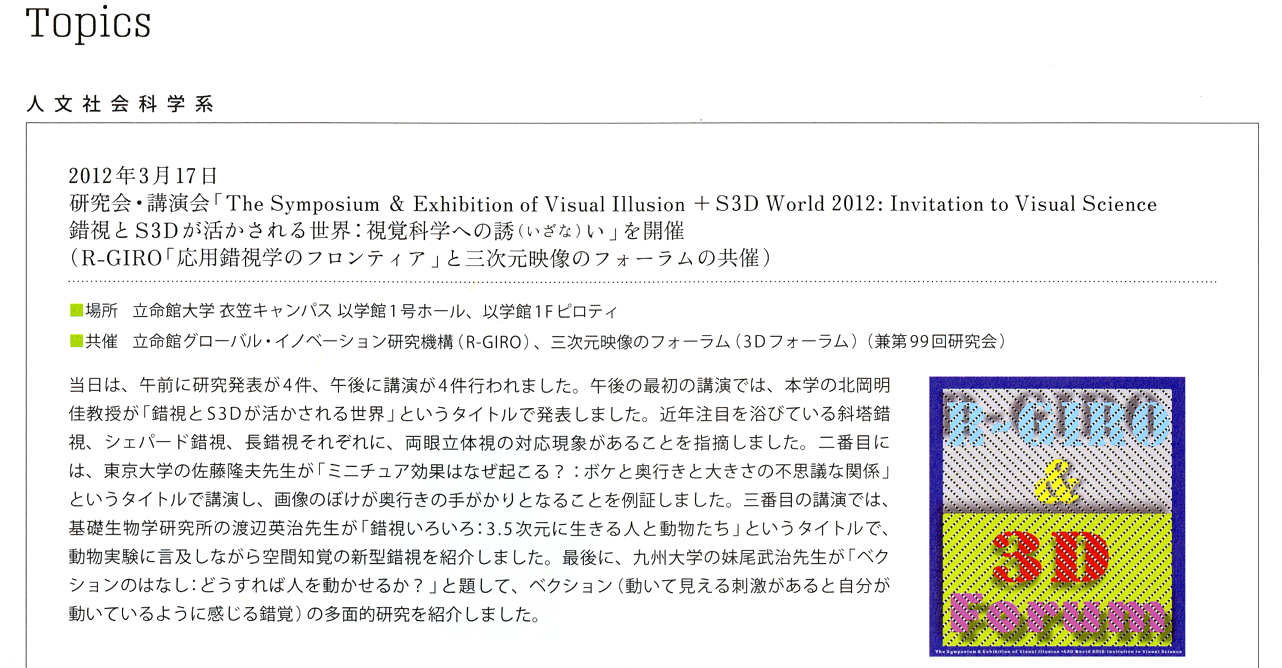 主催 立命館大学(立命館大学2012年度研究の国際化推進プログラム (研究代表者・北岡明佳) 「錯視の展開的研究」)