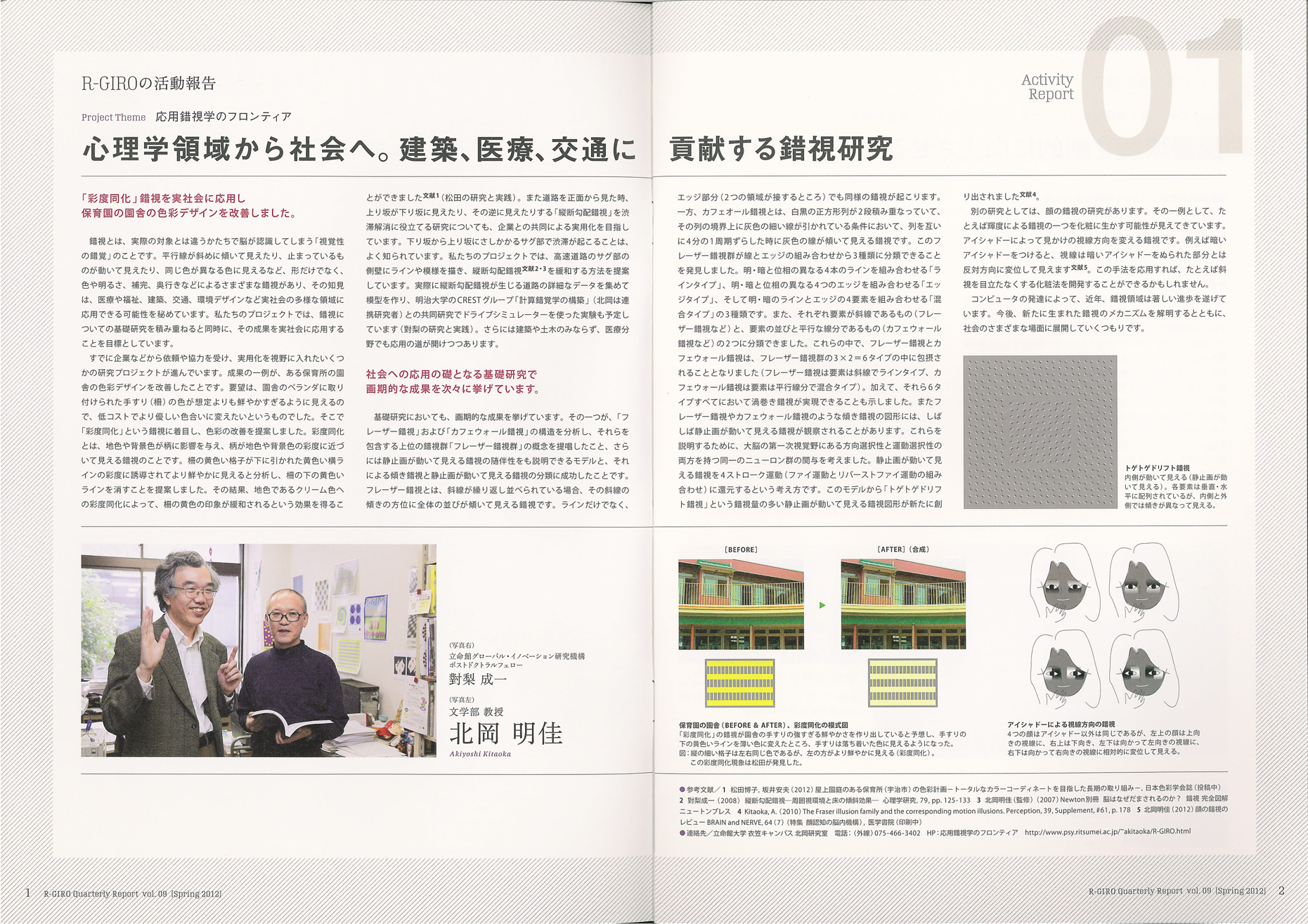 北岡明佳 (2012) R-GIROの活動報告 心理学領域から社会へ。建築、医療、交通に貢献する錯視研究 R-GIRO Quarterly Report 〔立命館グローバル・イノベーション研究機構四季報〕, 09 (Spring 2012), 1-2. PDF(スキャンコピー版・表紙付き) PDF(原版)