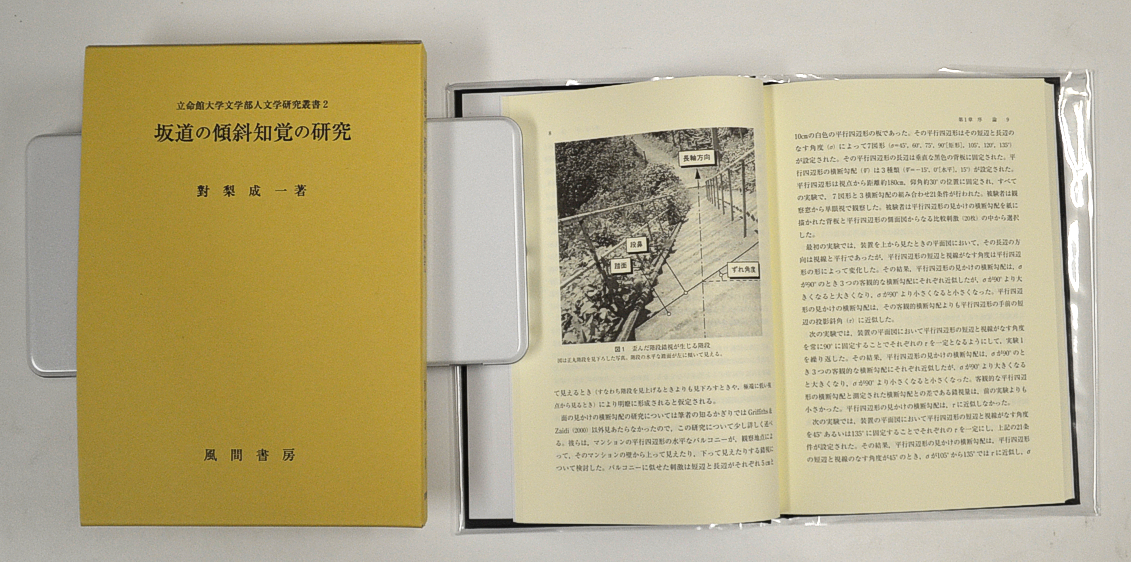 對梨成一 (2013) 立命館大学文学部人文学研究叢書 2 坂道の傾斜知覚の研究 風間書房 7,000円 ISBN978-4-7599-1983-7