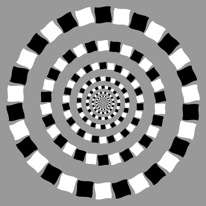 The left disk appears to rotate counterclockwise while the right one clockwise. Kitaoka and Ashida (2003) proposed that the illusory motion is strong when patterns are arranged in the following luminance order: from black, dark-gray, white, light-gray, and back to black.