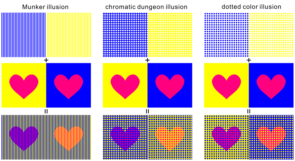 物理的に同じ色(R=255, G=0, B=127)のハートが錯視によってピンクとオレンジのハートに見える。左から、ムンカー錯視(Munker illusion)、色の土牢錯視(chromatic dungeon illusion)、ドット色錯視(dotted color illusion)、デヴァロイス・デヴァロイス錯視(De Valois-De Valois illusion)である。 上図の高解像度ファイルはこちら(8000 x 3262 pixel, 10MB)。