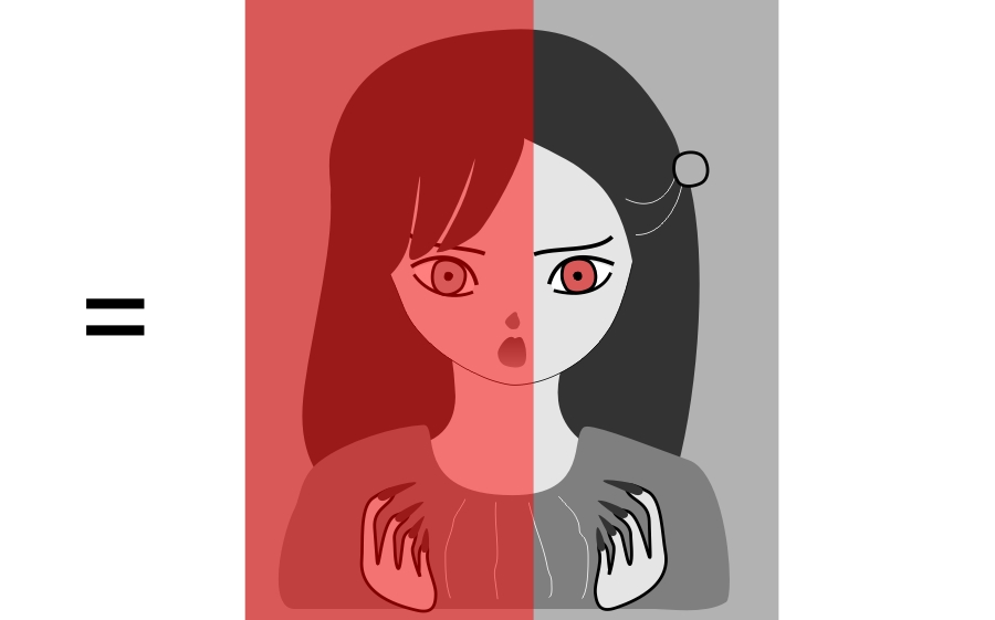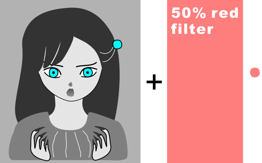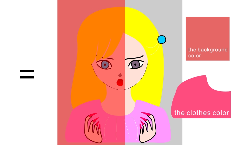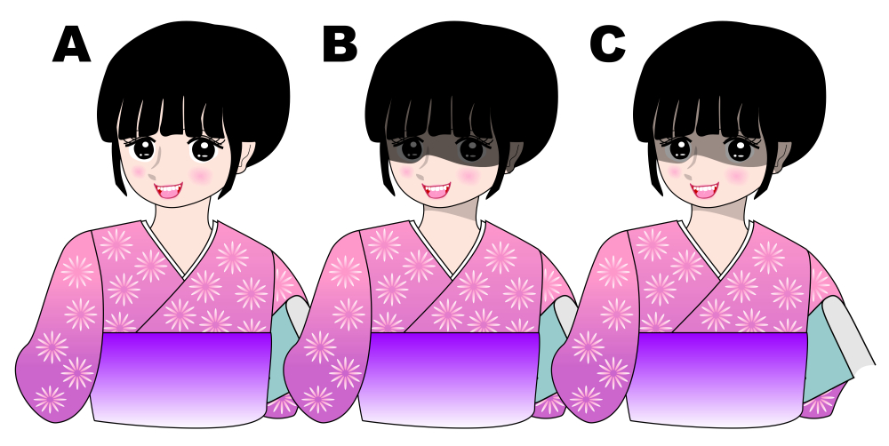 上図の人物の目は水色に見えるが、灰色である。この灰色は下図の背景の灰色と同じである。つまり、下図では錯視が起きていない。
