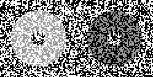 ランダムドット色錯視・・・左右の赤い領域は同じ色であるが、左はオレンジに、右はマゼンタに見える。