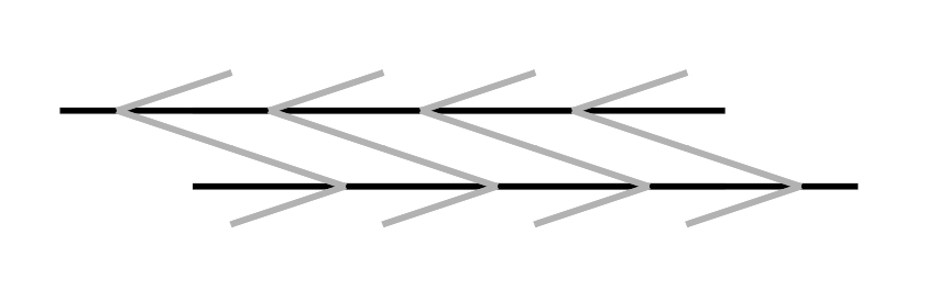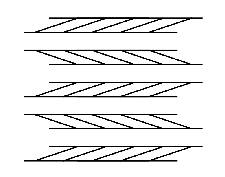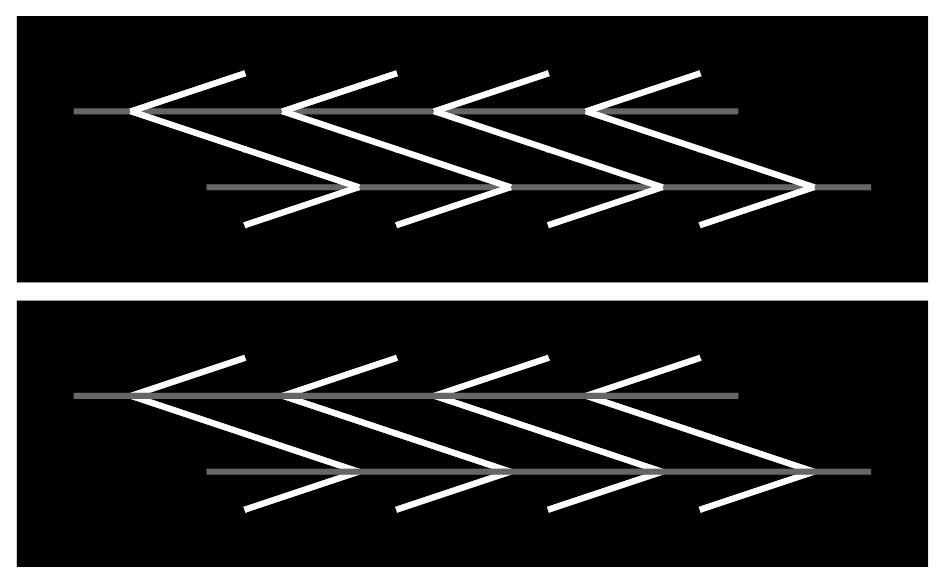 水平線は2本ずつ、上から右・左・右・左・右に傾いて見える(ツェルナー錯視)。水平線にはさらに動く錯視があって、上から左・右・右・左・左・右・右・左・左・右に動いているように見える。