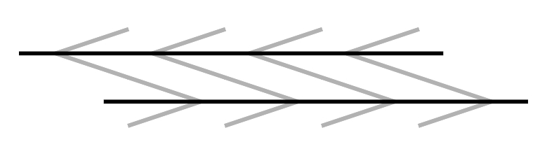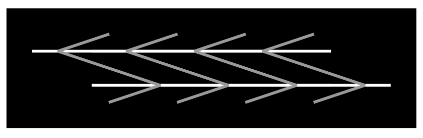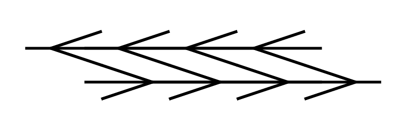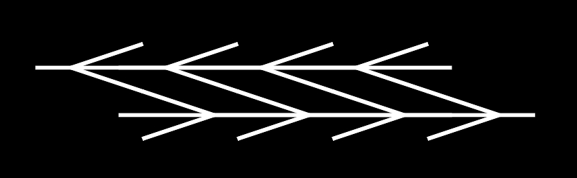 左右の矢羽の先端間の距離は同じであるが、左側が右側よりも長く見える(ミュラー・リヤー錯視・ブレンターノ型あるいはミュラー・リヤー錯視・接次図形)。この図には動く錯視があって、真ん中の矢羽が右に動いて見える。