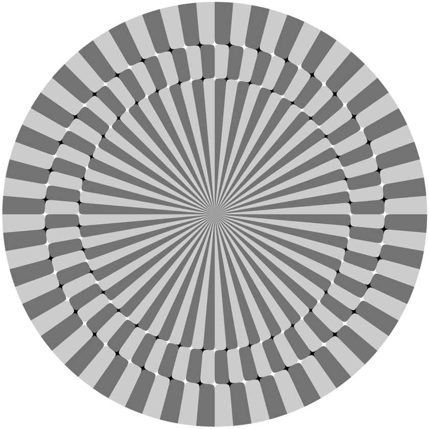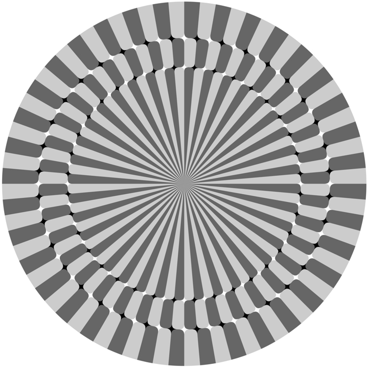 星型の「ニューロン」は同心円配置をしているが渦巻き配置に見える。そのほか、中心を見ながら目を近づけたり遠ざけたりすると図が回転して見える。 基本図