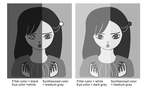 2つの図を両眼融合して見ると、右目は明るい灰色と暗い灰色の間の両眼闘争を起こすことがあるが、左目は中くらいの灰色に見えたままである。しかし、どちらの右目も左目と同じく、物理的には中くらいの灰色なのである。