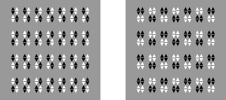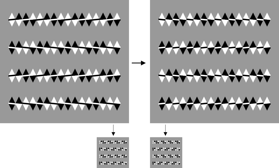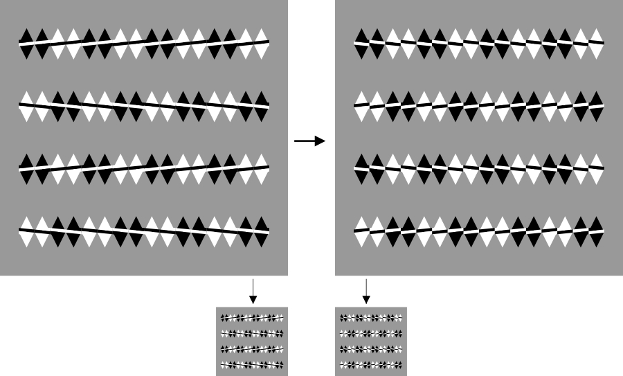 Reversed phi movement (Anstis and Rogers 1975). There are four rectangles, each of which is flanked by thin lines that are dark or light. When the luminance of the rectangles decreases and that of the background increases accordingly, the upper two appear to converge in motion while the lower two appear to go apart in motion. On the other hand, when the luminance of the rectangles increases and that of the background decreases accordingly, the upper two appear to go apart in motion while the lower two appear to approach each other in motion. In sum, the direction of apparent motion is from the dark flank to the neighboring part that goes darkening or from the light flank to the neighboring part that goes brightening. Although the rectangles are aligned vertically, the apparent positional displacement occurs in the opposite direction to motion. If observers cross-fuse (uncross-fuse) the right and left rectangles, the upper rectangle appears to be in front of (behind) the lower one when they are dark.