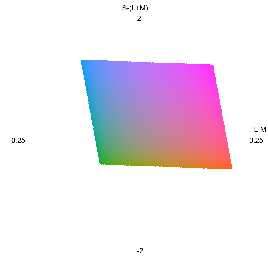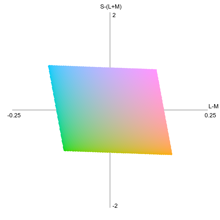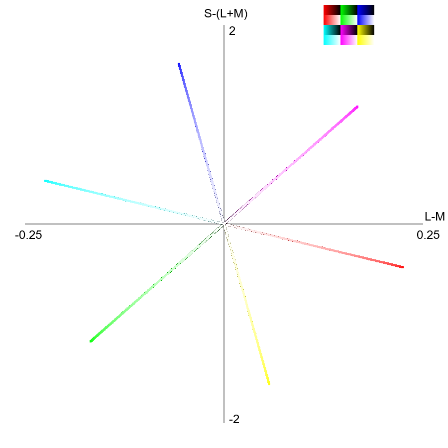 sRGBから計算したY値を基準とした等輝度色刺激図・その3。DKL空間。左上は Y = 0.075 ± 0.005、右上は Y = 0.300 ± 0.005、左下は Y = 0.500 ± 0.005、右下は Y = 0.800 ± 0.005 の輝度の色の集合である。