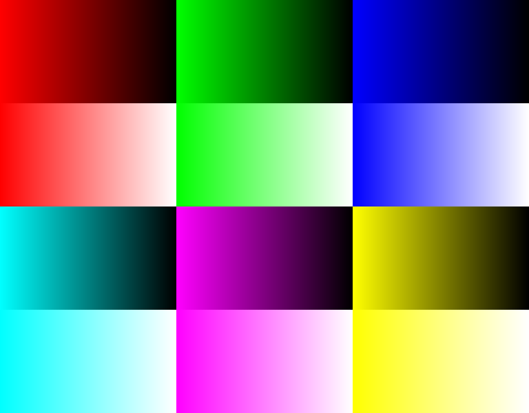 sRGBから計算したY値を基準とした等輝度色刺激図。左上は Y = 0.075 ± 0.005、右上は Y = 0.300 ± 0.005、左下は Y = 0.500 ± 0.005、右下は Y = 0.800 ± 0.005 の輝度の色の集合である。
