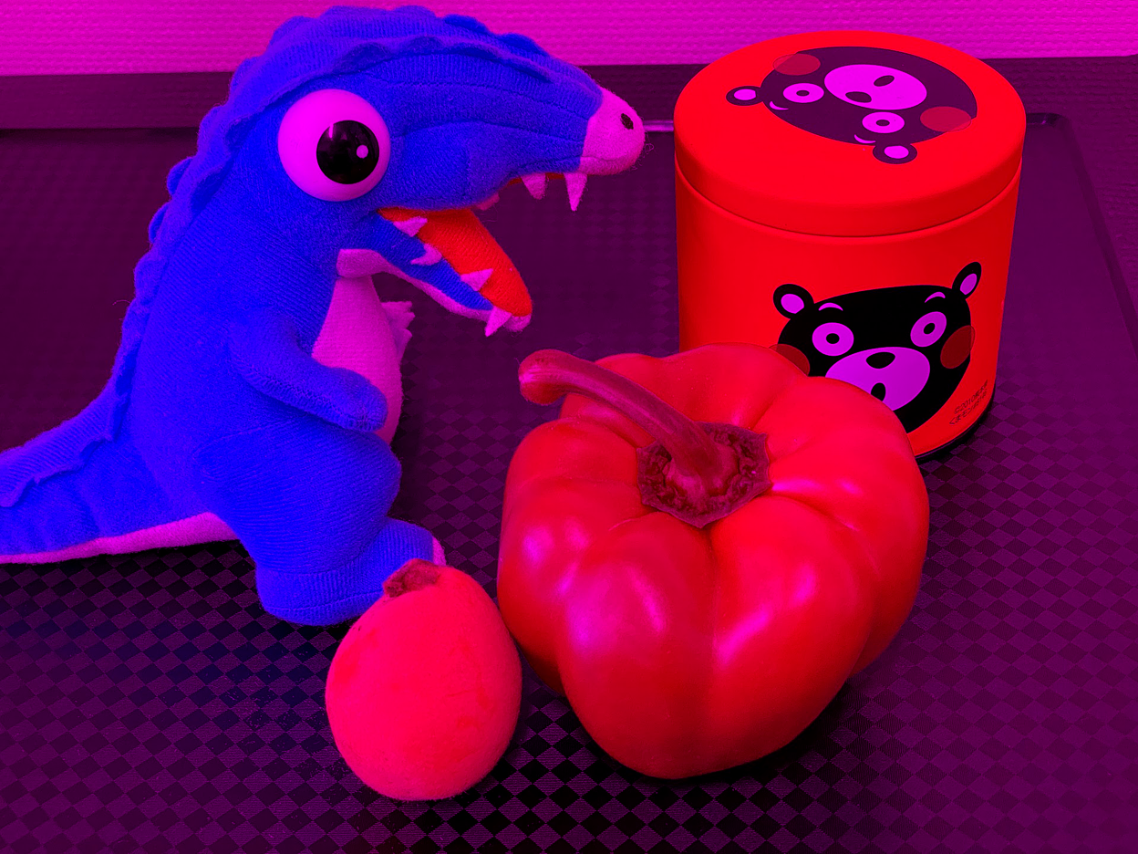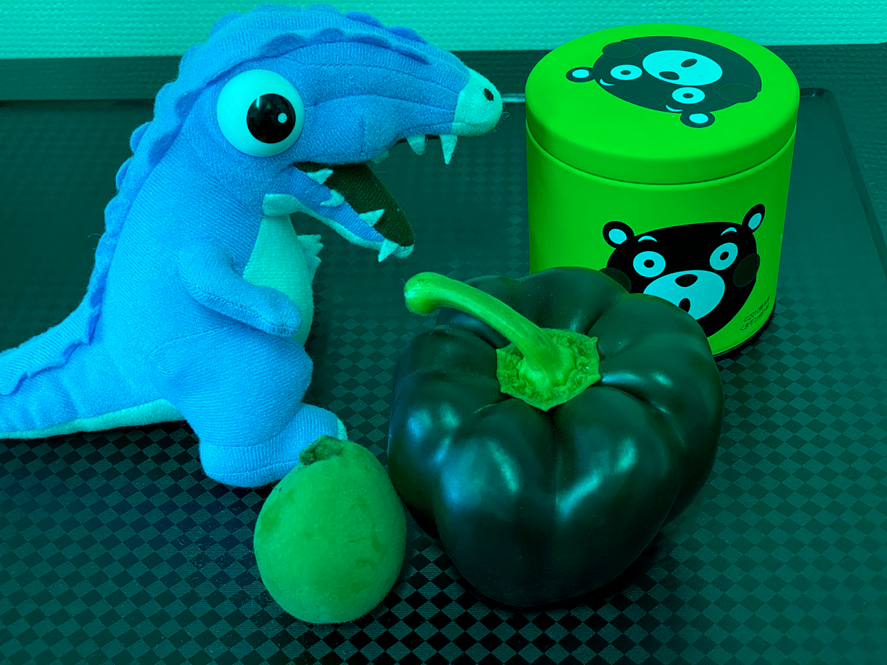 くまモンの缶は黄色く見えるが、この画像のすべての画素のR値はゼロなので、画素の色としては緑である。