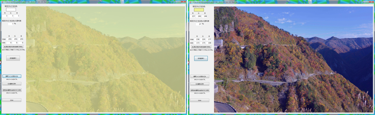 オリジナルの図と RGB = 220, 220, 150 の色の一様な面を 20% の透明度で合成した図が before の図である。推定された加法色と透明度は正しく算出されたが、画像には少し不満。