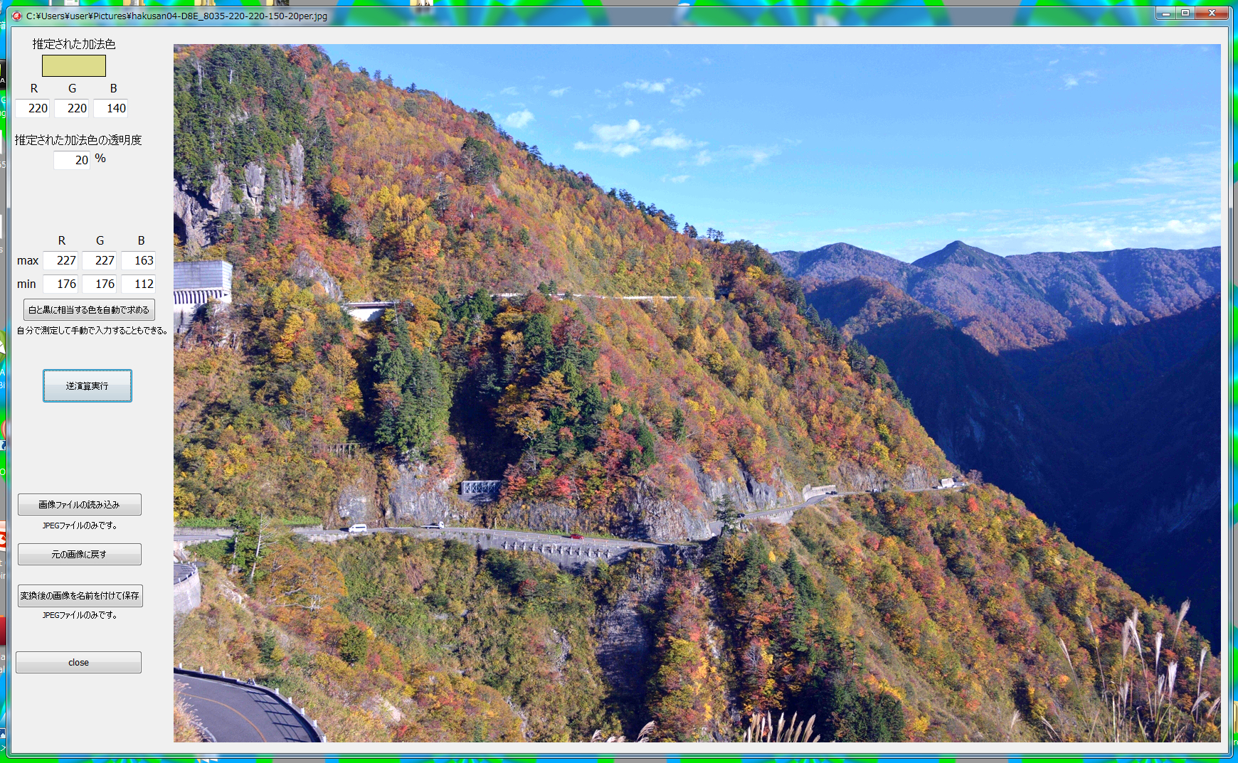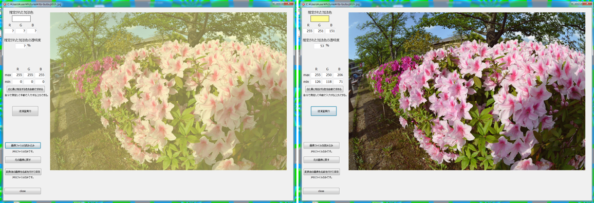 オリジナルのツツジの写真にかぶらせた色は RGB = 255, 250, 150 で透明度50%だったので、 RGB = 255, 251, 151 で透明度53% の計算結果は精度が高く、また復元された絵も満足するべき出来だと思う。