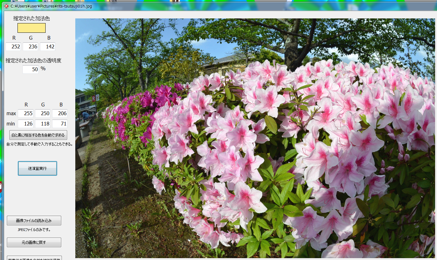 「加法的色変換の逆変換のプログラムによる立命館大学のツツジの写真の復元」