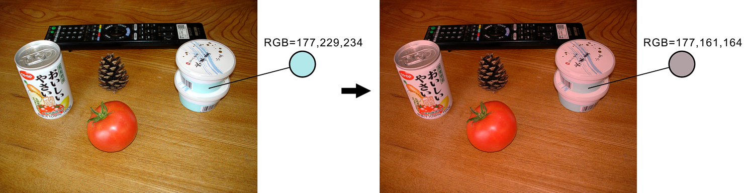である。要するに左側の色変換は不自然であり、そのような知覚は
