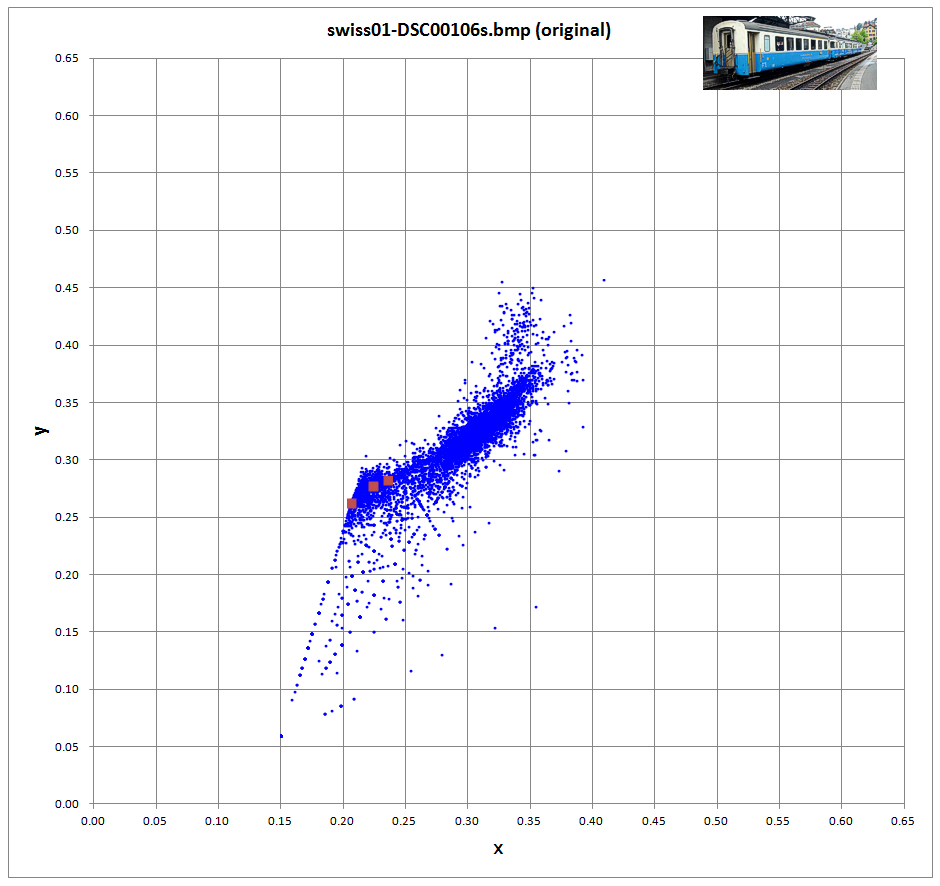 sRGBに従ってリニアRGB化した値を用いて計算した。以下同様。青く見えるところはほぼ灰色(白色点)である。